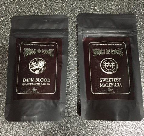 It’s interesting when bands inspire some creation for a sensory experience beyond their music. I remember enjoying one of BEHEMOTH’s coffees a couple years ago, and I’ve also gone through a few bottles of MARILYN MANSON’s absinthe. Unfortunately, I have yet to get my hands on any of the beers that many bands are putting out these days. Now CRADLE OF FILTH has joined with Pitch Black North to bring us two varieties of tea crafted in their name. Since I happen to be a long-time CRADLE fan that drinks tea almost every day, I didn’t think twice about checking these out. “Dark Blood” is for the morning wake-up and draws its name from “Of Dark Blood and Fucking” on From the Cradle to Enslave. The second blend is an evening mellower named “Sweetest Maleficia” after the song from Godspeed on the Devil’s Thunder. The objective here is to share my impressions on these teas without pretending to be a serious connoisseur.